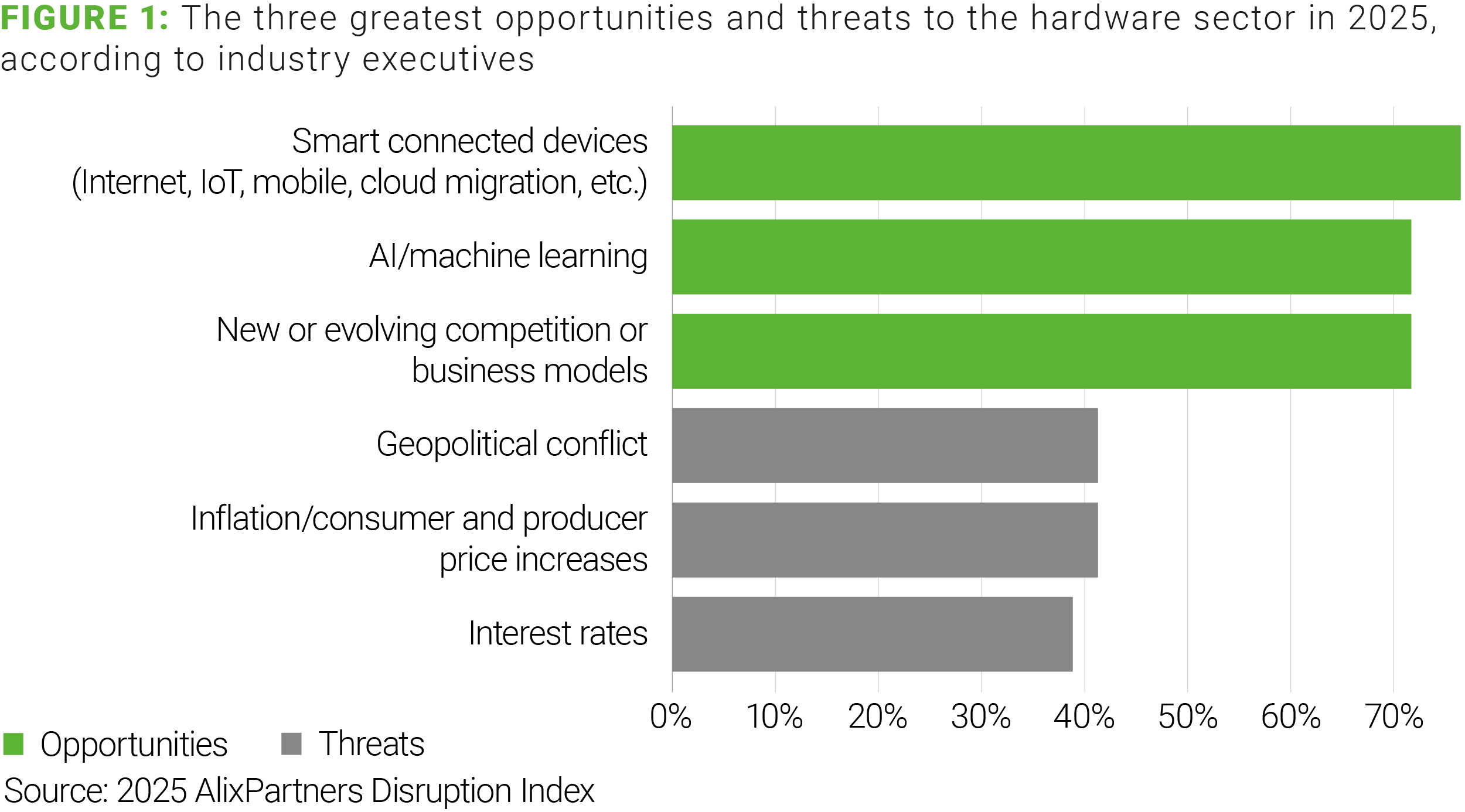 According to the 2025 AlixPartners Disruption Index, geopolitical conflict is the top threat to technology hardware companies worldwide. This instability leads to inflation, price concerns, and interest rate increases. But alongside these threats, hardware executives are optimistic about the impact cutting-edge technologies will have on the industry in 2025. Namely, they see smart connected devices, AI, and machine learning—as well as the new business models these technologies bring about—as major growth opportunities.